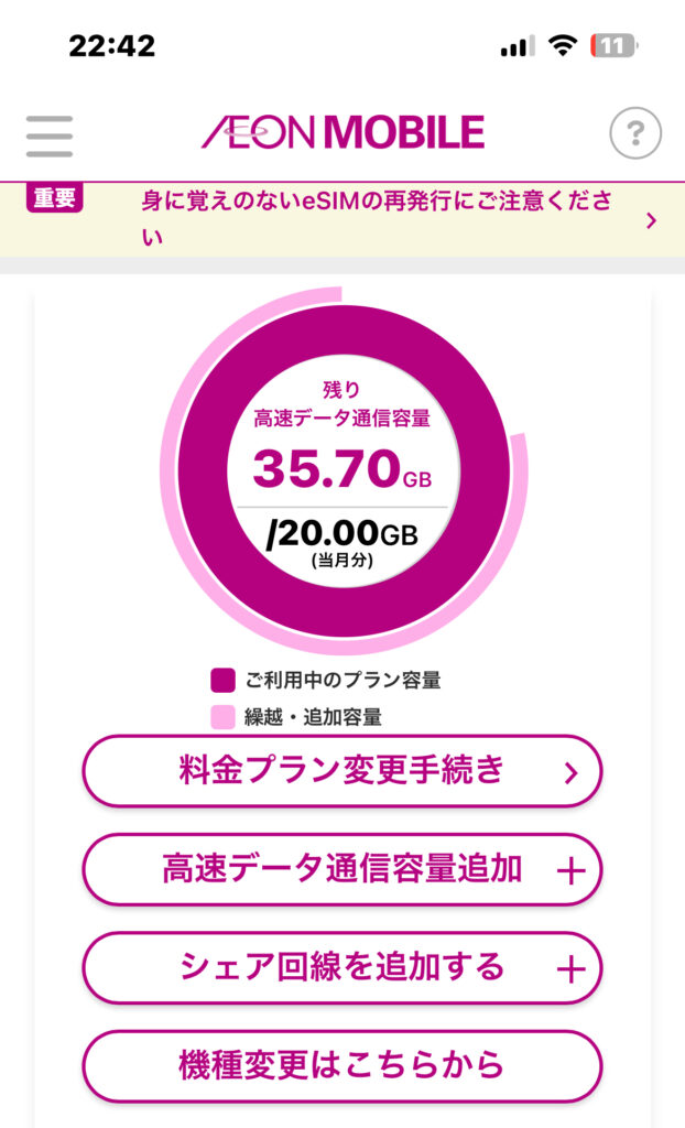 今月は6日時点で先月の分を使っている状態です。こんな感じで利用状況がスマホで確認できます。